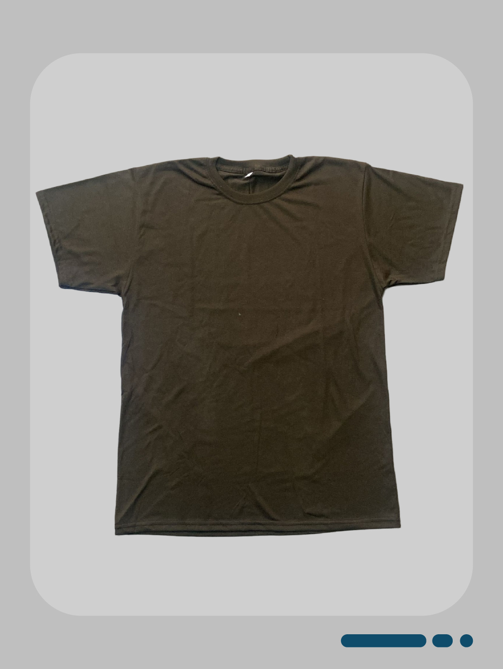camiseta tipo jersey 65% poliéster, 35% algodón, confeccionada en color verde aceituna, cuello en rib del mismo color.